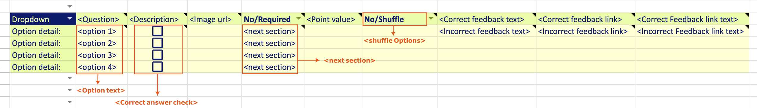 - Options: Populate the dropdown with a list of answer options. You can add or remove rows in your sheet to adjust the options as needed.